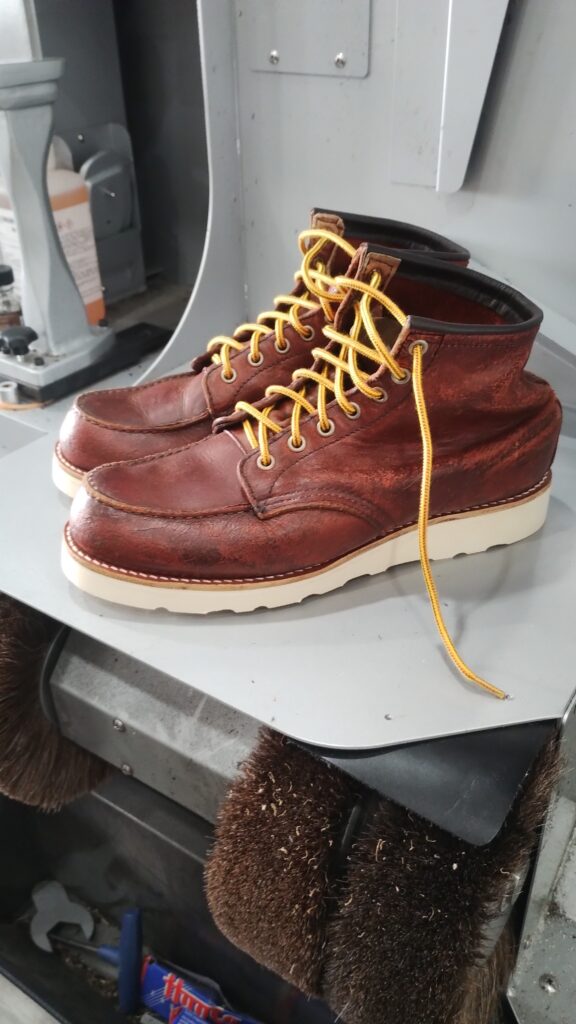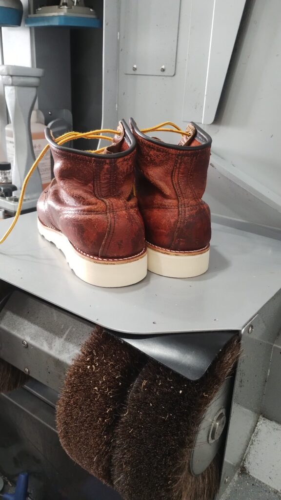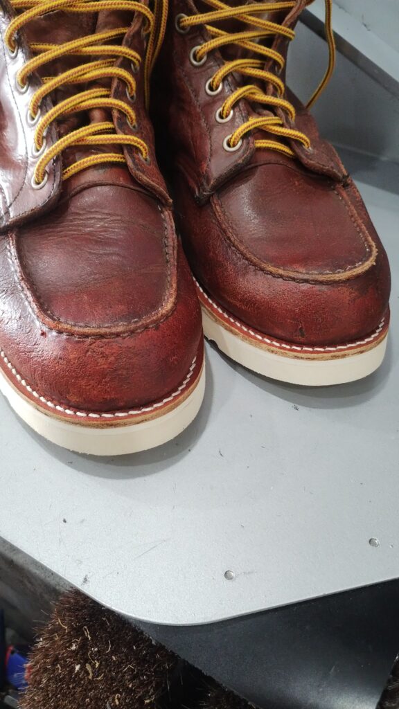 ある程度色褪せが戻っていますがレッドウイング純正の靴クリームで磨いたのみの処置です。